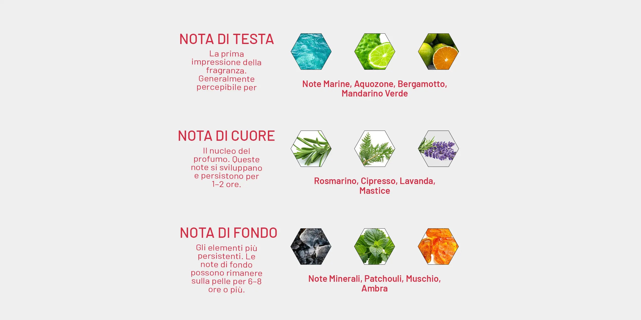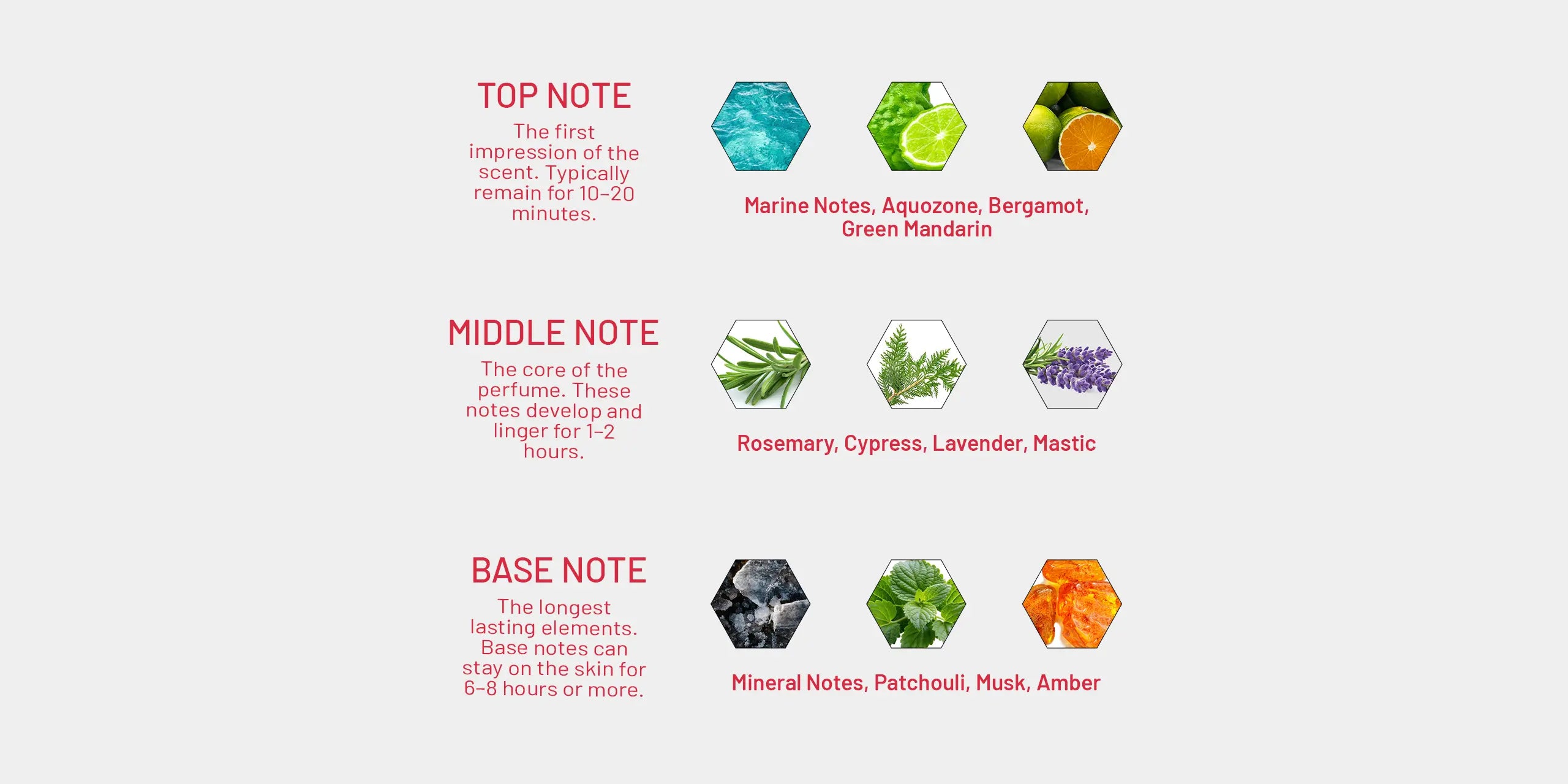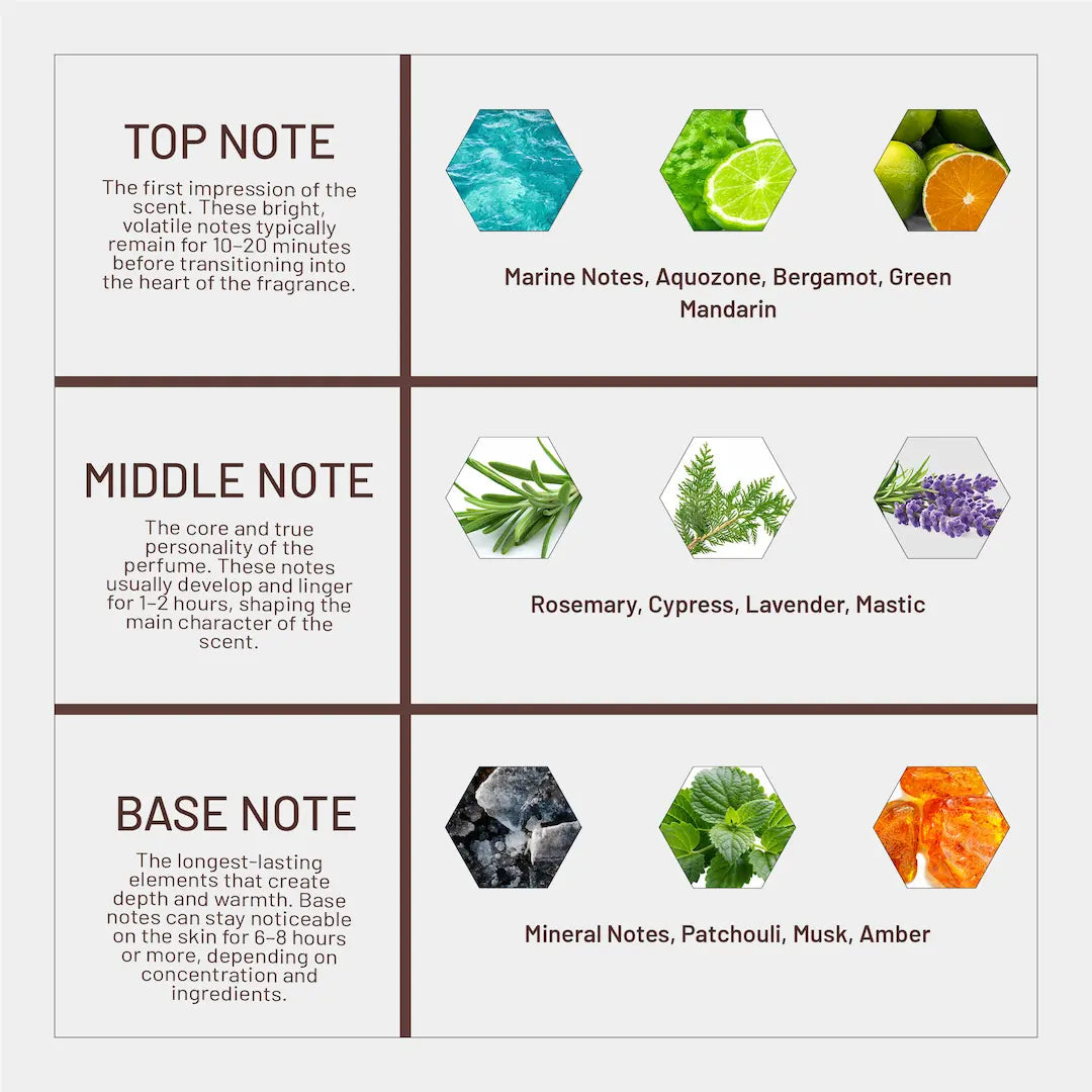 Base: Mineral Notes, Patchouli, Musk, Amber