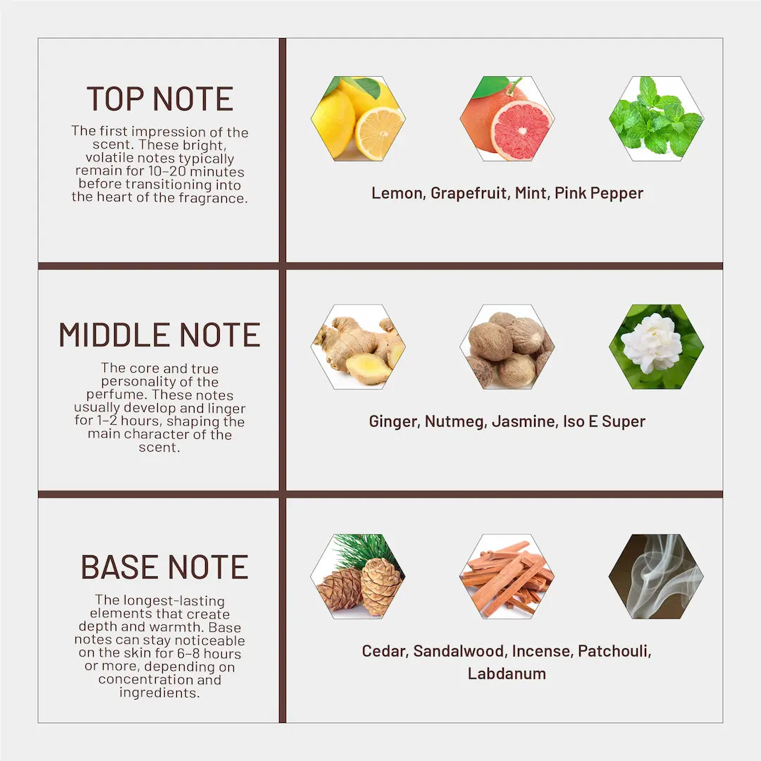 Middle: Ginger, Nutmeg, Jasmine, Iso E Super