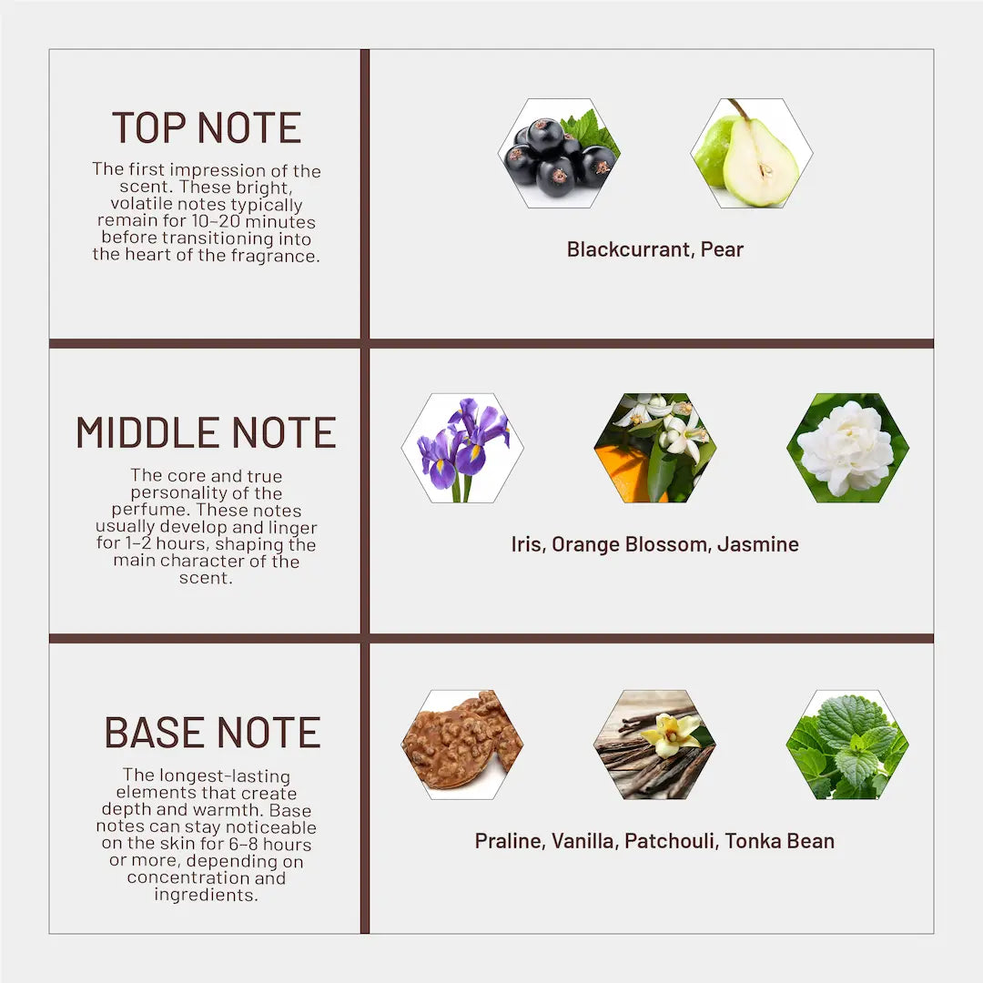 Base: Praline, Vanilla, Patchouli, Tonka Bean
