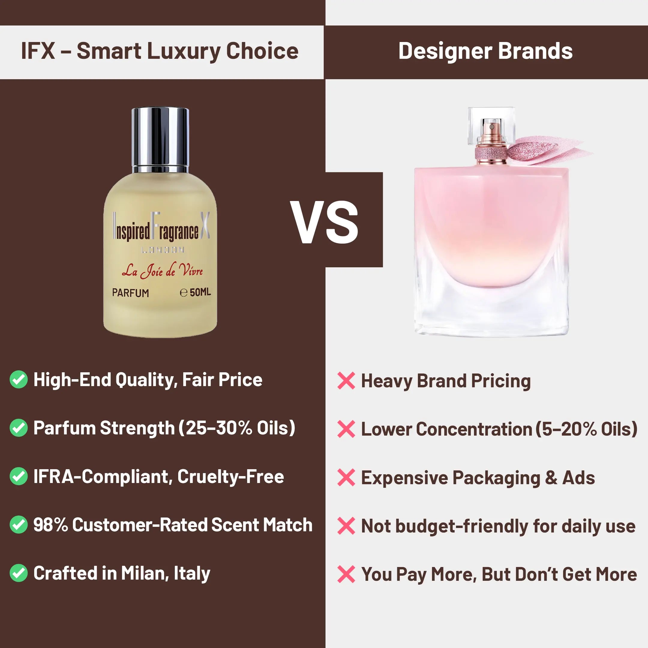 Inspired by La Vie Est Belle, La Joie de Vivre is a sweet, uplifting alternative with a similar blend of florals and gourmand notes. Bright pear and blackcurrant open the fragrance before warm vanilla and praline take over. The soft floral heart adds balance, making it joyful and comforting. A great dupe for fans of sweet, feminine perfumes.