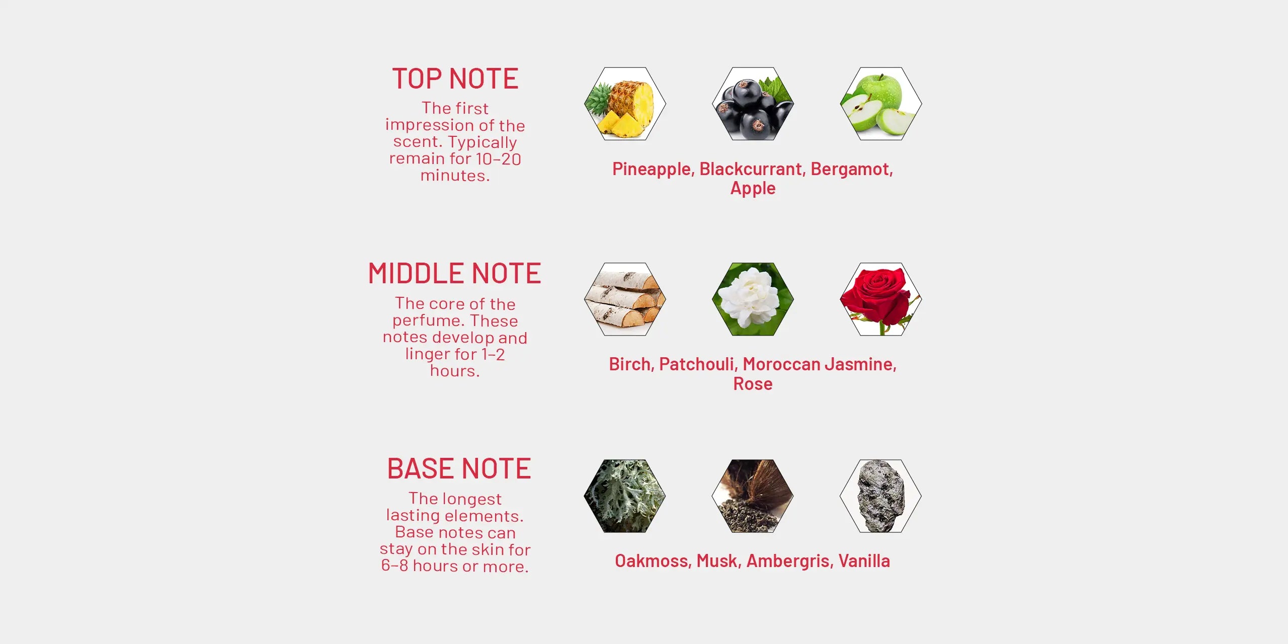 Middle: Birch, Patchouli, Moroccan Jasmine, Rose