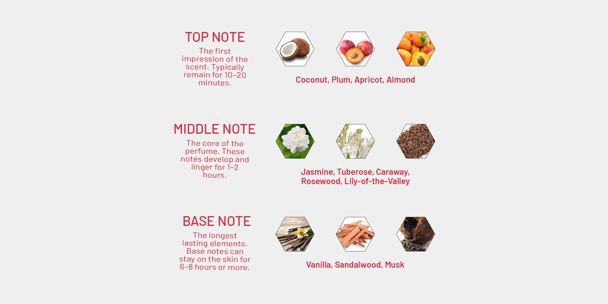 Middle: Jasmine, Tuberose, Caraway, Rosewood, Lily-of-the-Valley